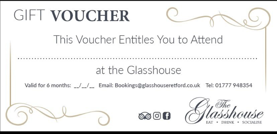 Gift vouchers, The Glasshouse, www.glasshouseretford.co.uk or email bookings@glasshouseretford.co.uk